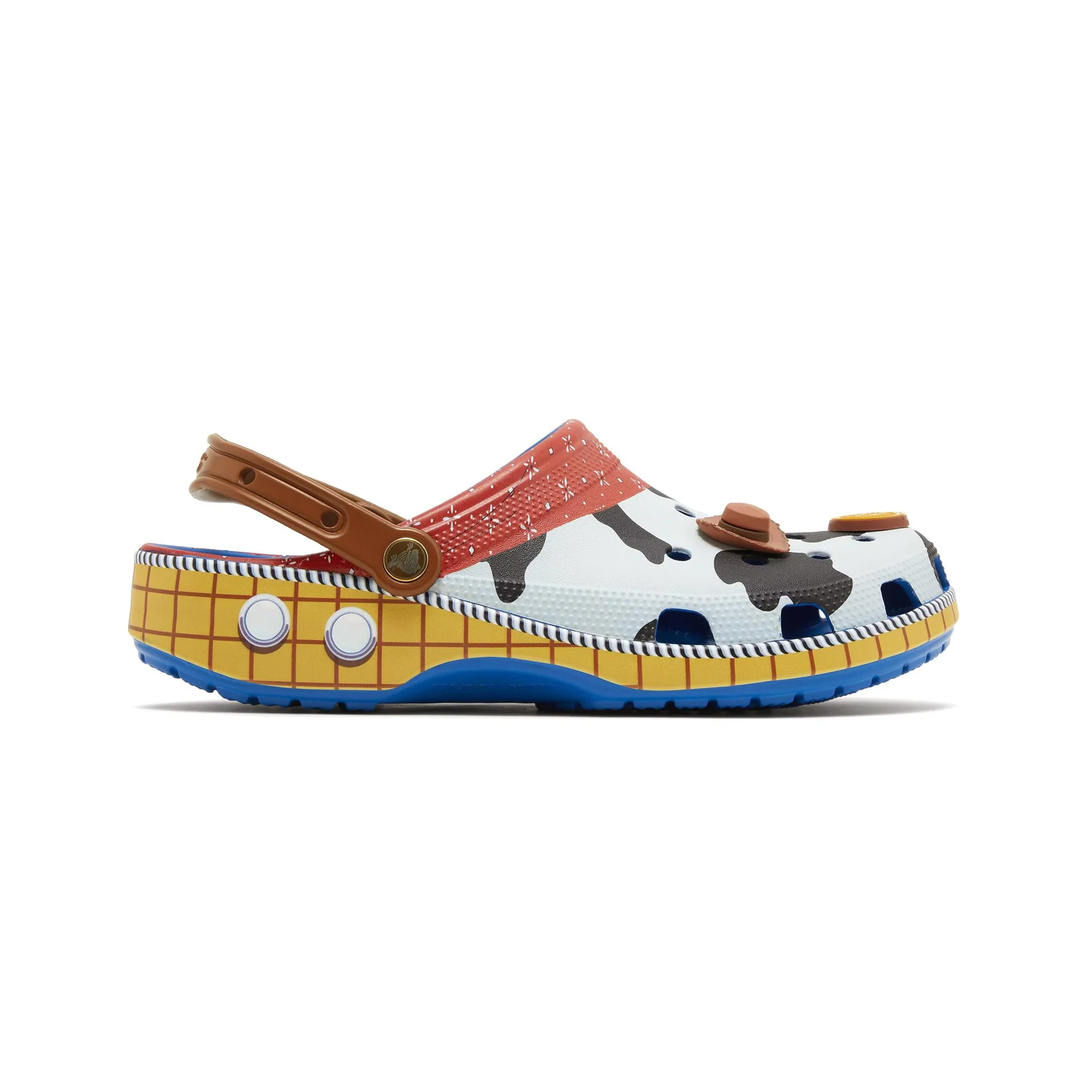 - Nostalgic Toy Story Theme: Captures the essence of Woody with a yellow base, blue heel strap, and sheriff badge Jibbitz charm.
