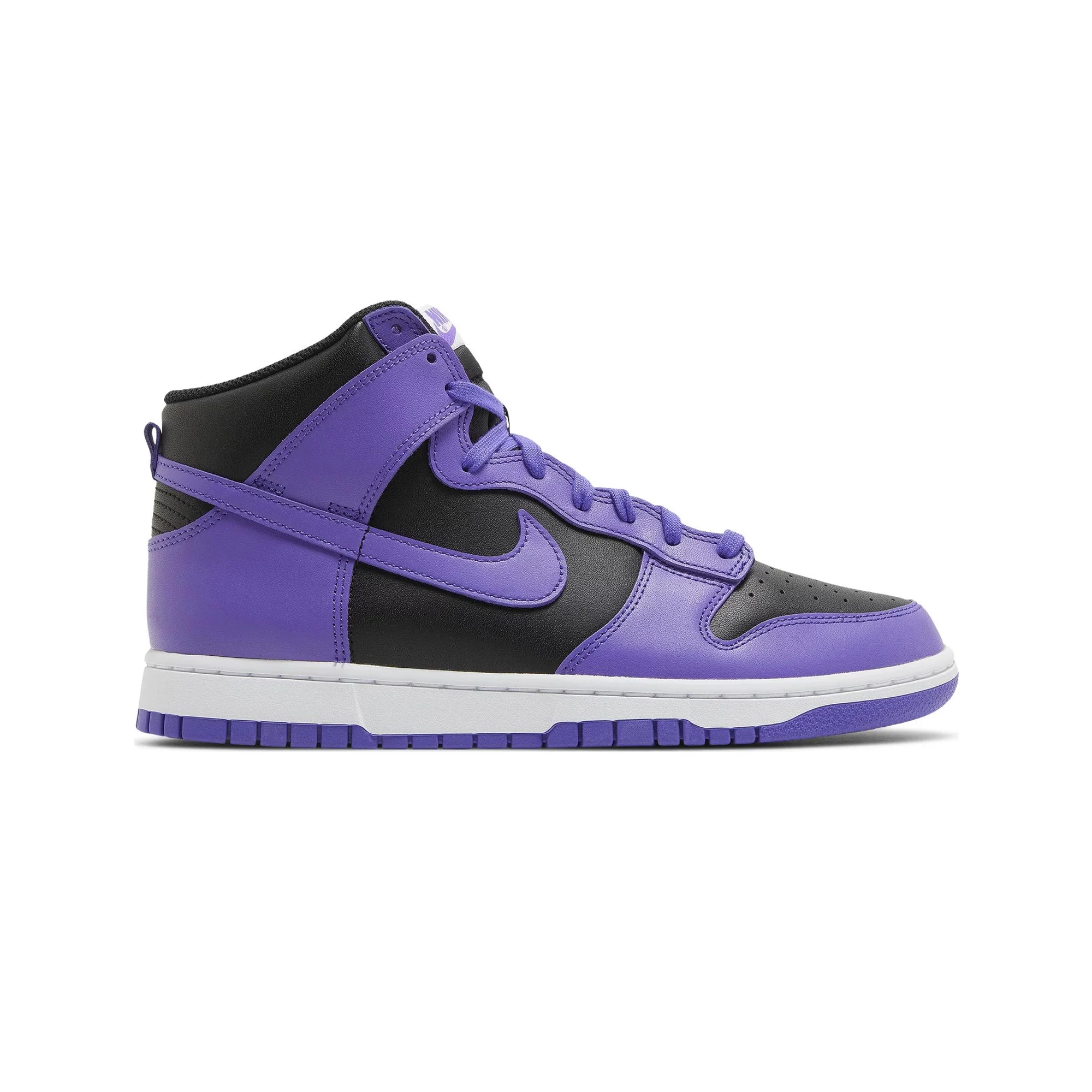 The Nike Dunk High 'Psychic Purple' is meticulously crafted with a robust leather base, exuding durability and premium quality. The upper is drenched in a mesmerizing shade of "Psychic Purple," offering a visually captivating aesthetic. This bold hue is contrasted by crisp white accents on the Swoosh, laces, and midsole, creating a harmonious balance that highlights the sneaker's dynamic design. The high-top construction provides ample ankle support, while the padded collar and tongue ensure comfort during extended wear. The perforated toe box enhances breathability, making it an ideal choice for both casual outings and athletic endeavors.